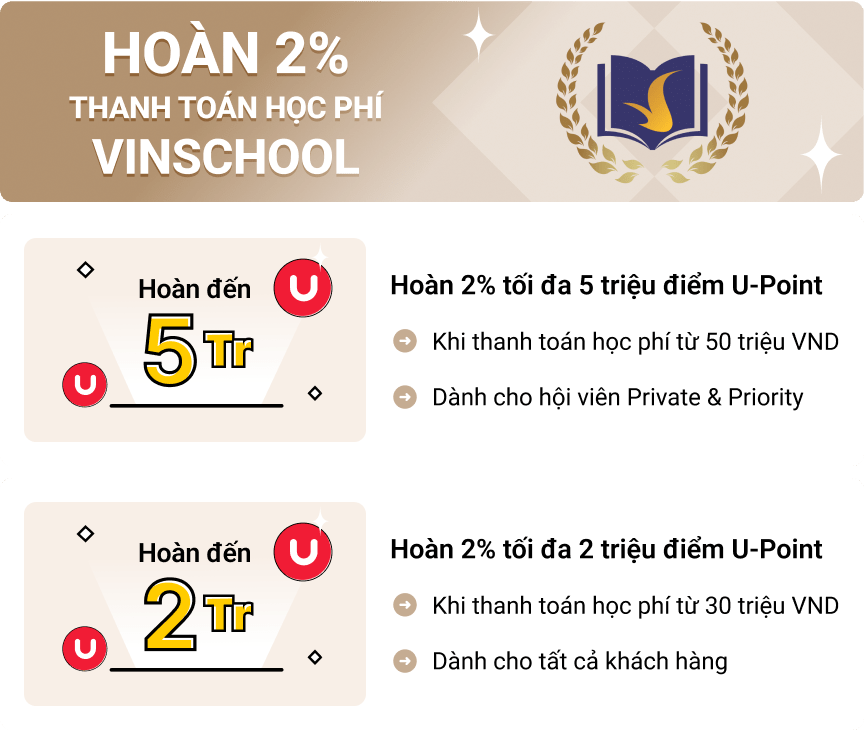 Với mong muốn mang đến những giá trị tốt nhất trên hành trình giáo dục của con, dành tặng ba mẹ ưu đãi đặc quyền khi thanh toán học phí tại Vinschool với thẻ Techcombank.